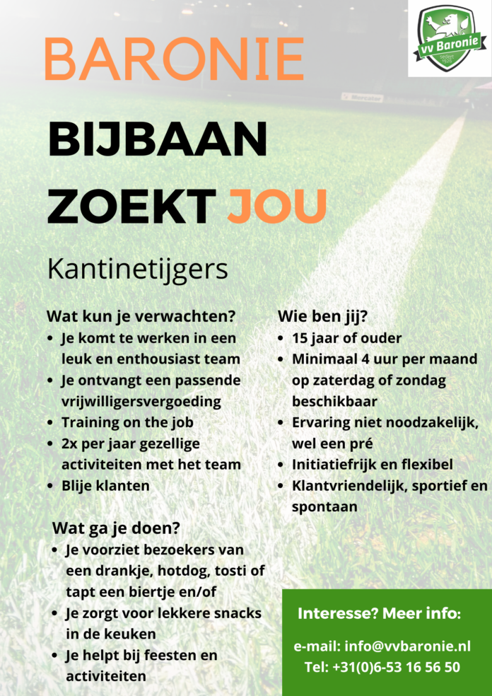 Klinkt goed? Stuur dan een mailtje naar info@vvbaronie.nl of een appje naar of bel naar Judith van der Veeken via (06-53165650) en meld je aan of loop even binnen in de kantine! Samen houden we de kantine draaiende รฉn de frituur lekker warm! ๐ฅ๐