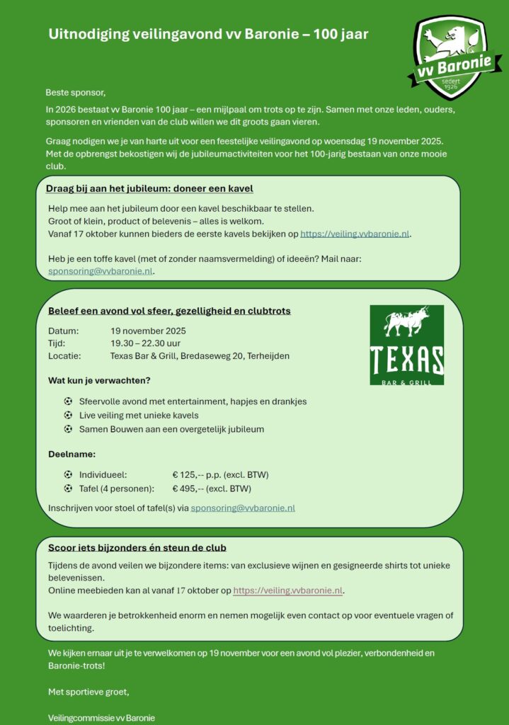 Yes! De veiling site van vv Baronie is live. Neem snel een kijkje op veiling.vvbaronie.nl. Je vindt er onder andere: