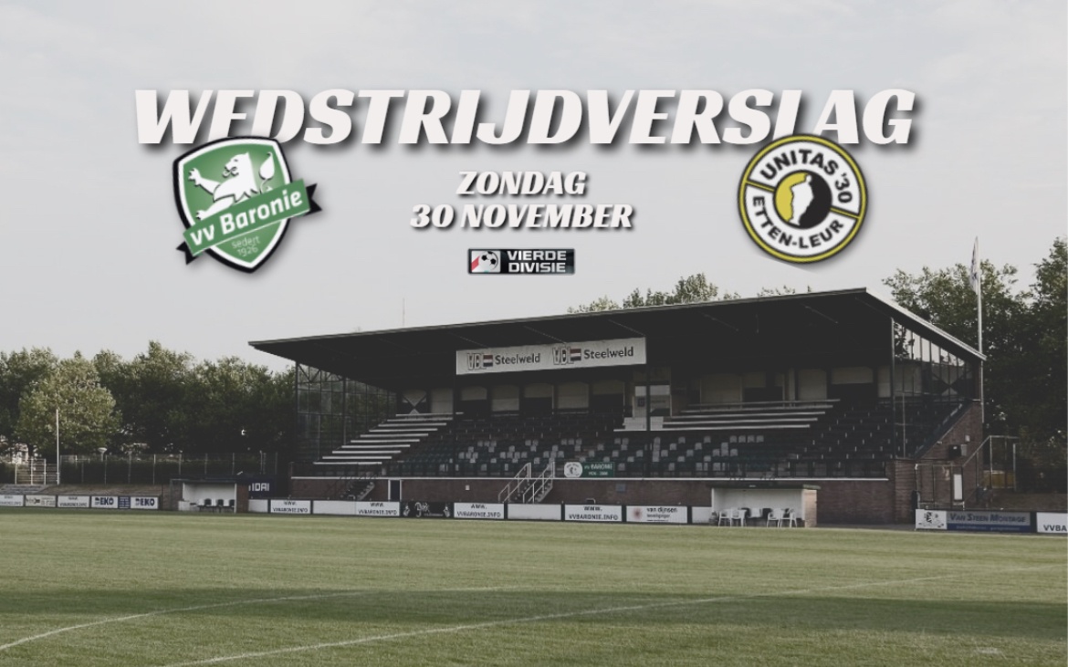 Dat angst zelden of nooit een goede raadgever is bewezen Baronie en Unitas ’30 vanmiddag. Beide ploegen toonden dat de stand op de ranglijst niet toevallig was en schotelden het schaars opgekomen publiek in deze streekderby weliswaar een uiterst sportieve wedstrijd voor die echter voetbaltechnisch absoluut niet kon boeien. De bezoekers openden eigenlijk onverwachts met een agressief optreden dat meteen drie corners opleverde. Slechts een kopbal van Unitas-aanvaller Van Zwam leverde enige dreiging op. Ofschoon Unitas’30 aanvankelijk voor het eerste gevaar zorgde was het de thuisclub die voor het eerst echt gevaarlijk werd. Van Eerd schampte een voorzet van Meierdres met het hoofd maar zag zijn poging rakelings naast de verkeerde kant van de paal vliegen. Baronie nam langzamerhand het initiatief over maar kwam niettemin volkomen onverwachts op achterstand. Geklungel in de Bredase verdediging bracht de bal bij ex-Baron Tijn van Galen die van dichtbij simpel raak kon knikken 0-1. De thuisclub had niet direct een antwoord en verzandde vervolgens in weinig overtuigend geschuif waarbij het heilig vuur leek te ontbreken. Een zich als vanouds onderscheidende Townsend nam echter het voortouw en zag Van Eerd uit zijn voorzet rakelings voorlangs richten. Het was uiteindelijk toch weer Townsend die vlak voor rust aan de basis stond van de gelijkmaker. Diens voorzet leek op het kopgrage hoofd van Van Eerd te belanden die echter door Unitas’30-doelman Schipperen werd getorpedeerd. Scheidsrechter Sterre Bijlsma was onverbiddelijk en wees direct en overtuigend naar de penaltystip. Meierdres bracht zijn ploeg vervolgens beheerst op gelijke hoogte 1-1.