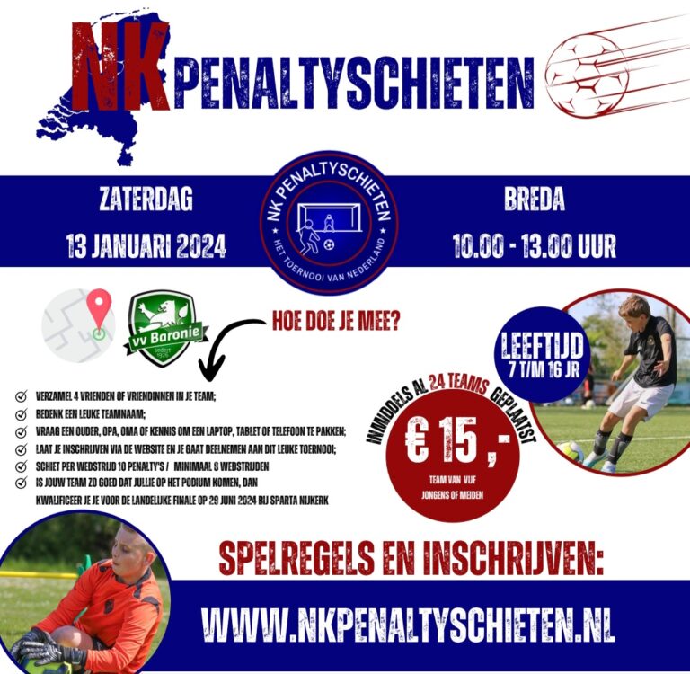 Op zaterdag 13 januari 2024 wordt er op de velden van vv Baronie de 4evoorronde van het NK Penaltyschieten gehouden. Het toernooi zal plaatsvinden in de onderstaande categorieën:O8 – Leeftijden 7 jaar (boys en girls)O9 /O10– Leeftijden 8 en 9…
