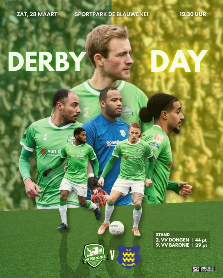 Kom kijken naar de derby in de vierde divisie. Aftrap om 19.30 uur. Jeugdleden kunnen penalty schieten in de rust en de jongste jeugd kan meelopen in de line up en krijgt een snoepzakje. Ben jij er ook bij?